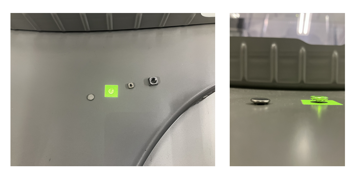 NG箇所をワーク上に色で示す運用が可能です。 塗布なら「不足箇所」、ボルトなら「付け忘れ位置と要確認位置」を現物上で直感提示でき、確認や申し送りが速くなります。