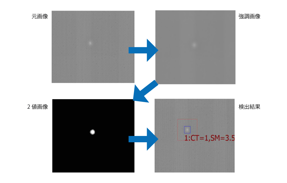 ムラの欠陥種類は多岐にわたるので、単一の処理ではすべてに対応することは難しいです。今回の例は、局所的な点状のムラになるため、比較的容易に検査が可能となります。