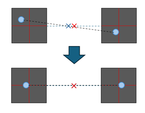 ランダムな位置からアライメントを行い、整合判定規格(目標位置とのズレ量の許容値)を厳しくしていったときのアライメント完了までの収束回数を比較します。位置決め装置FV-alignerⅡのオートアライメント機能を使用し、アライメント手法は2マーク対応点(本実験では目標位置は2つのカメラのそれぞれの中心を設定)を使用します。アライメント動作の概要は次の通りです。