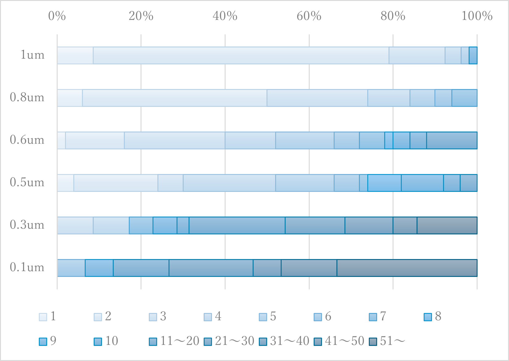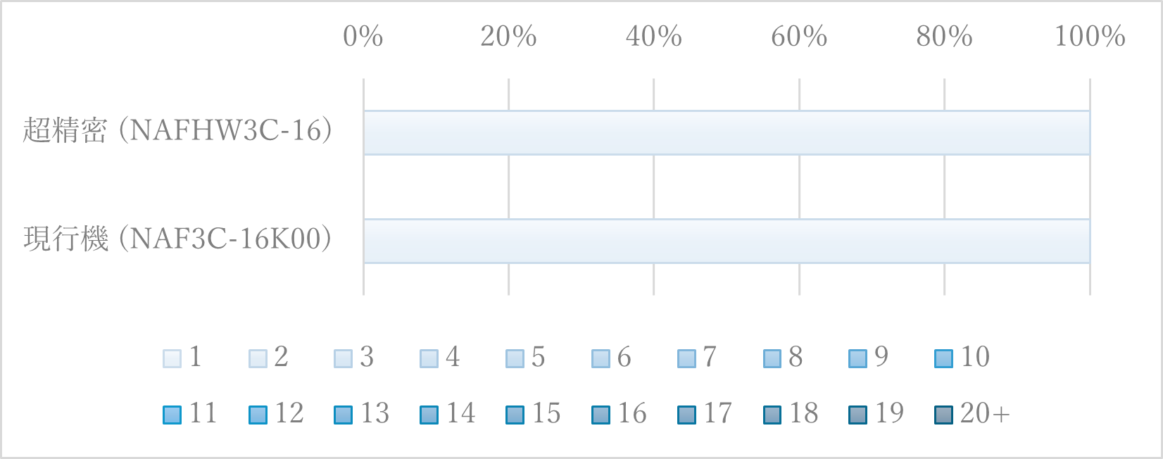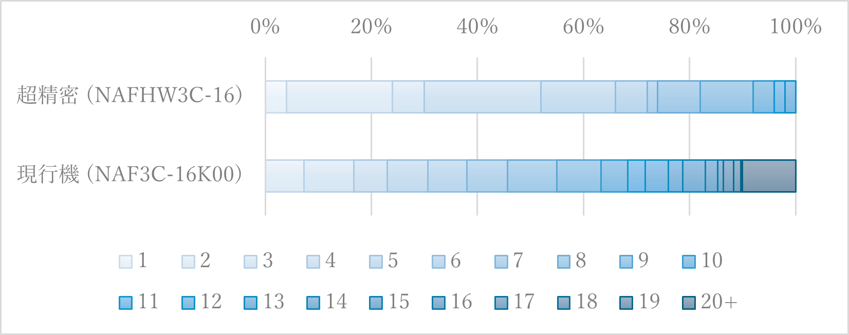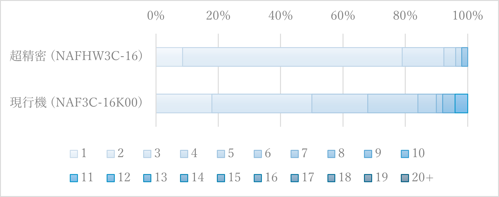 整合判定規格が10μmのときにはどちらも1回でアライメント完了できますが、1μmとなると超精密ステージは約80%が2回以内に完了するのに対して通常版ステージでは約20%弱しか2回以内には完了できませんでした。0.5μmとなると、超精密ステージは約半数が5回以内に、約95%が10回以内に完了するのに対して、通常版ステージでは5回以内の完了は約30%、10回以内の完了は約70%弱です。
