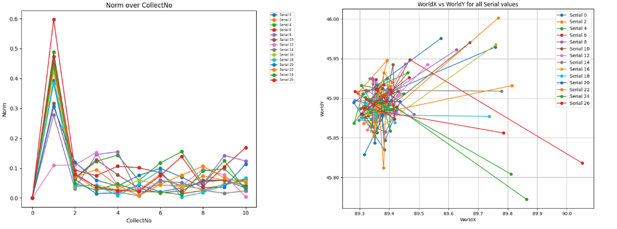 右図:各収束動作で求められたステージ回転中心の座標をプロットしたグラフ