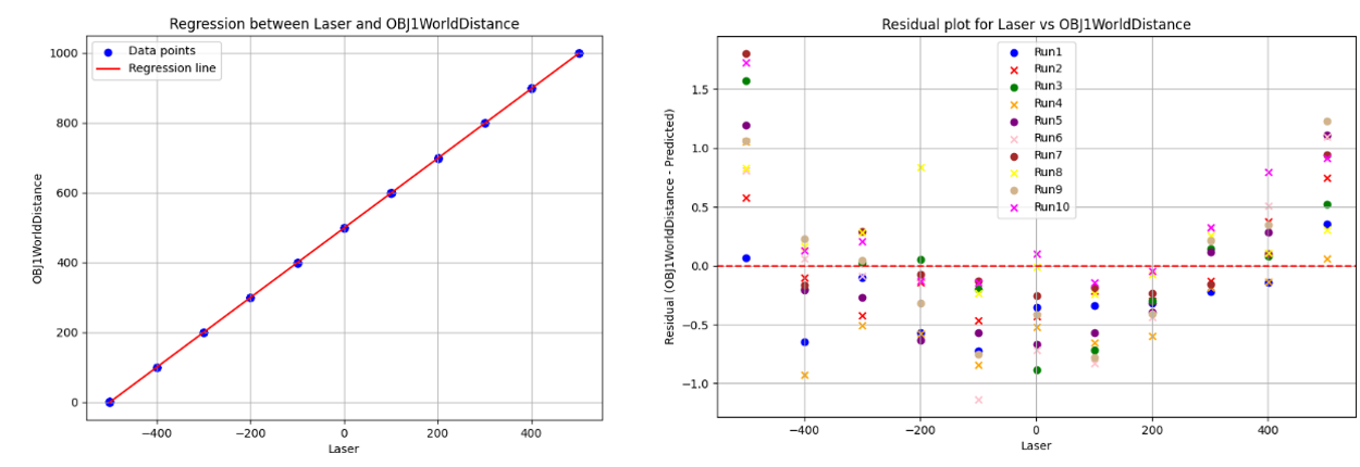 ステージ上に画像で検出するマークを設置し、X方向またはY方向に0.1mmピッチで-0.5mmから+0.5mmまで往復移動させます。このときのレーザ測長器の移動量と画像上でマークを検出したサーチ結果を比較します。0.1mmの移動量は画素分解能から計算すると約239.8ピクセルに相当します。