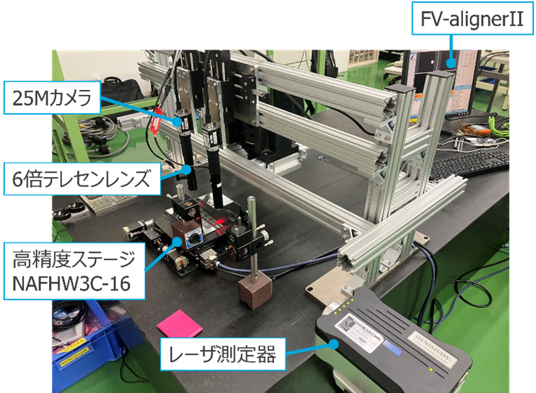 画像処理には当社の位置決め装置FV-alignerⅡ(モーションボードを搭載したUNTタイプ)を使用します。光学系は正方形センサの25Mピクセルカメラと6倍のテレセントリックレンズを組み合わせた、画素分解能0.417μm/pixelの構成です。