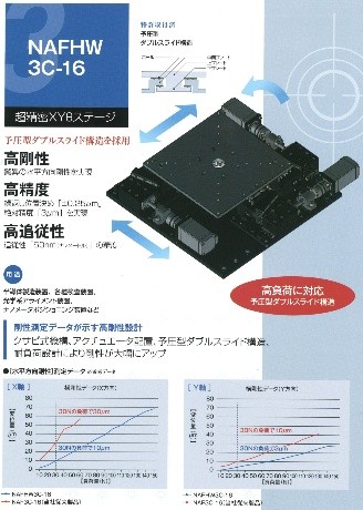 ステージはヒーハイスト株式会社様に超精密XYθステージNAFHW3C-16をご用意いただきました。このステージは絶対位置決め精度で3μm(θ軸:12 sec)、追従性で50nmという高精度な仕様のものです。