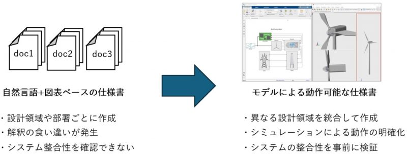 従来の開発では、自然言語+図表ベースの仕様書をもとに各領域の設計 (ソフトウェアやハードウェア) を個別に進め、最終段階での統合が一般的でした。しかしこのような手法では、解釈に食い違いが発生したり、システム設計の妥当性を早期に確認できずに開発途中での不具合や設計の不整合が発覚した場合に手戻りが大きくなるという課題がありました。