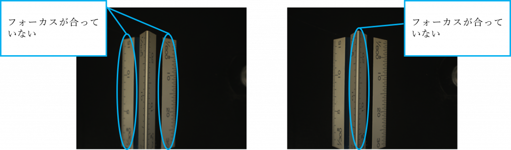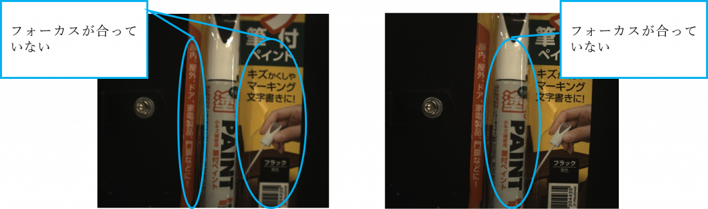 左図:手前側にピントが合っている状態、右図:奥側にピントが合っている状態