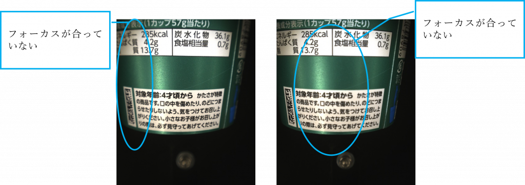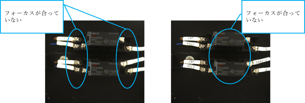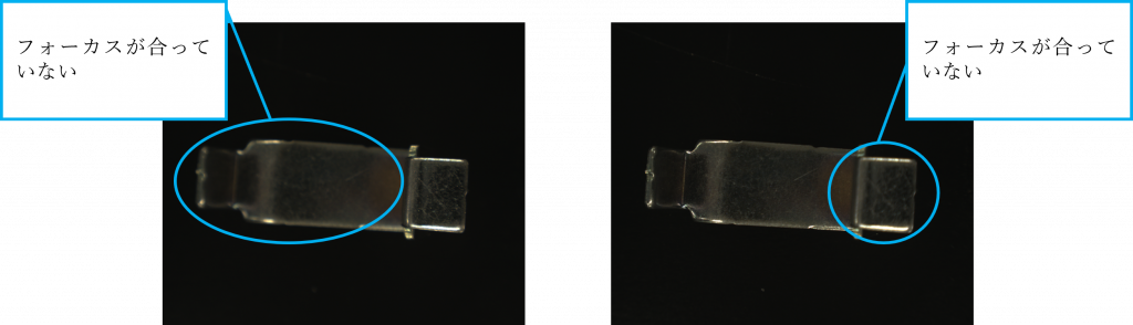 カメラで画像を撮るには被写界深度の制約があります。高さの違いが大きい対象物に対して全体にピントの合った画像を撮るためには、離れた位置から撮るなどの工夫が必要です。しかし、装置の中での設計上、カメラ取付位置の自由度には限度があります。