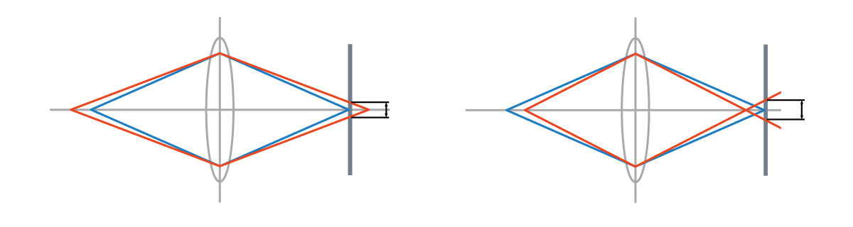 橙色線とイメージセンサとの交点の幅が錯乱円の直径です。錯乱円がイメージセンサのピクセルサイズよりも大きくなると、本来1点に見えるものが複数画素に跨って観測されるようになります。これが「ボケている」と言われる状態です。